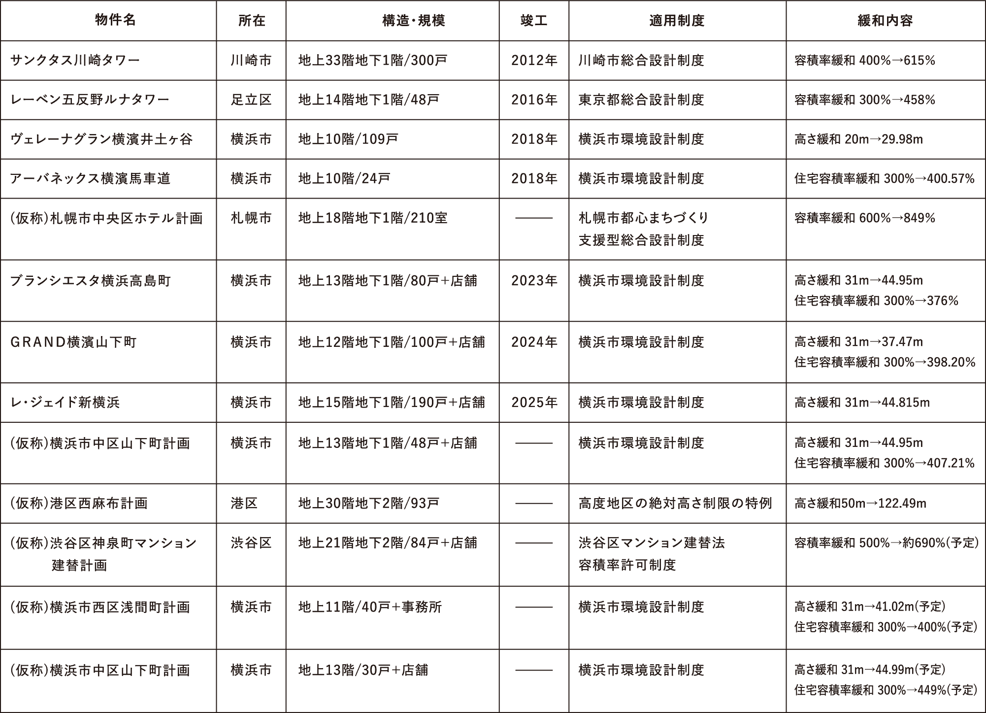 総合設計をはじめ、各種法令に基づく容積率の割増や高さ制限の緩和の許認可について多くの実績があります。(下表参照)